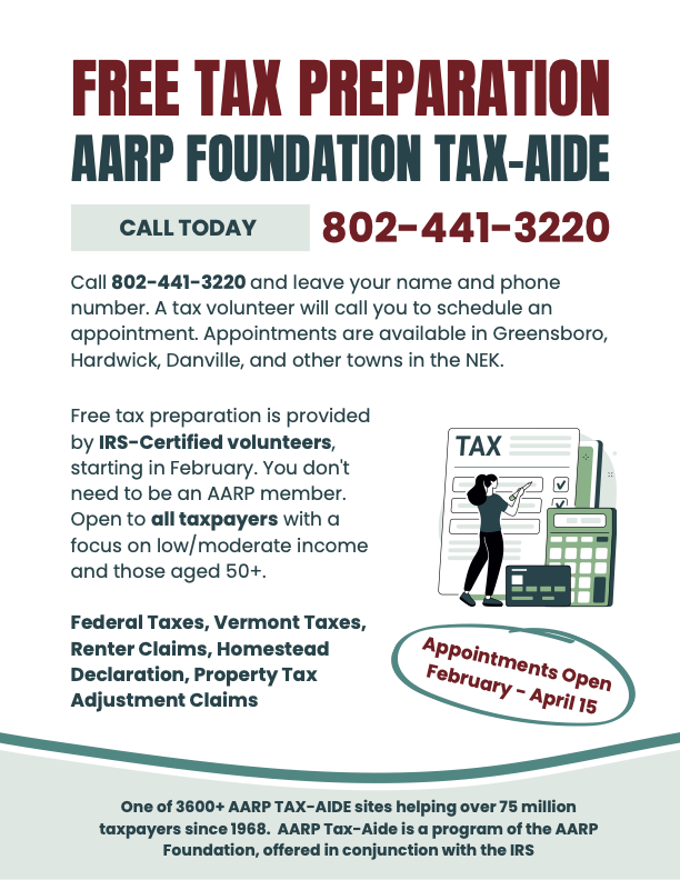 Call 802-441-3220 to schedule an appointment. Leave a message and a tax volunteer will be in touch.